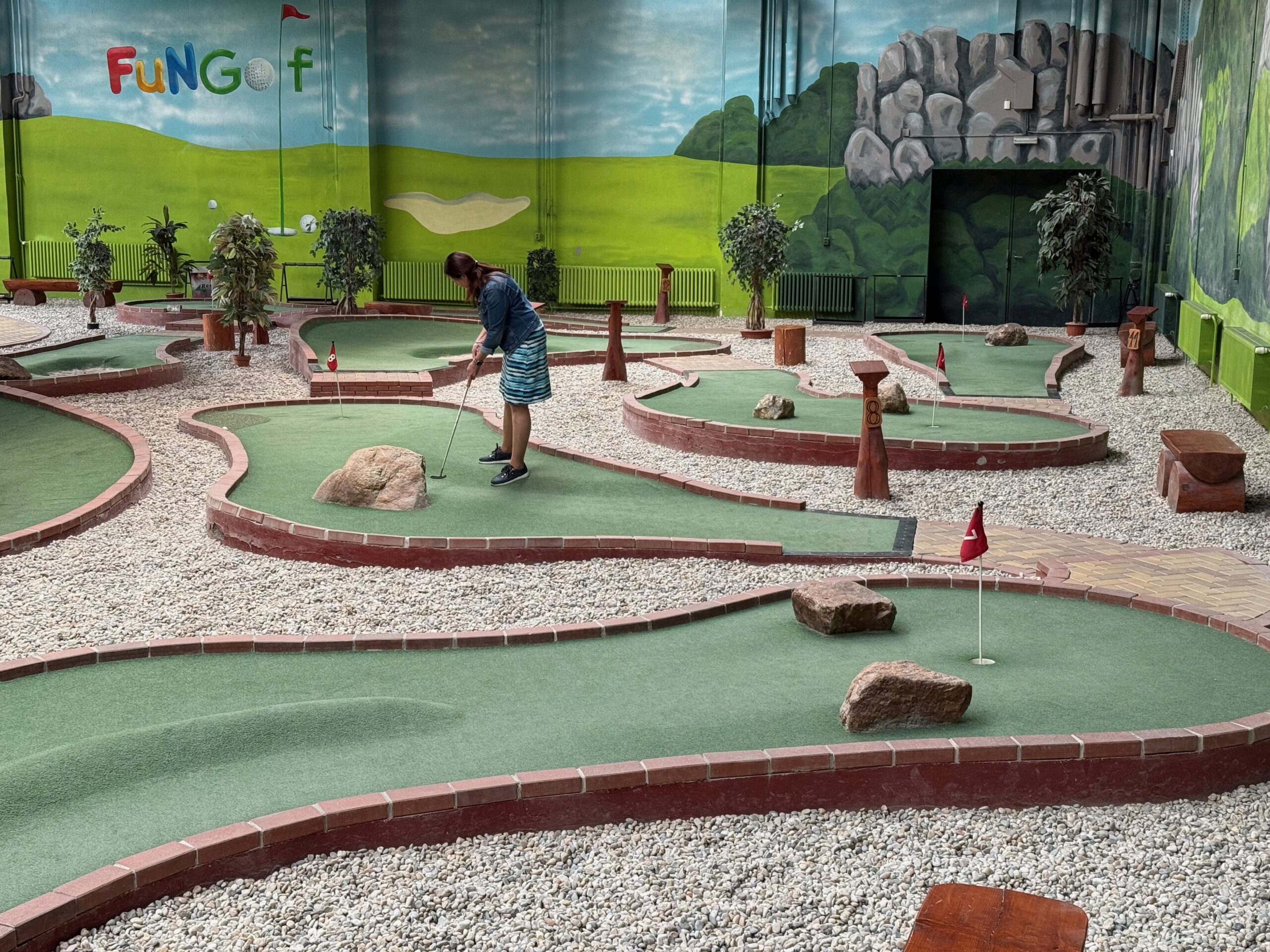 zmenšená verze klasického golfu: pískové bunkry, skalky i terénní nerovnosti. Celá hra s 18 jamkami vás pohltí svou atmosférou, a to ať už patříte mezi zkušené golfisty, nebo si chcete užít napínavé zápolení s rodinou.